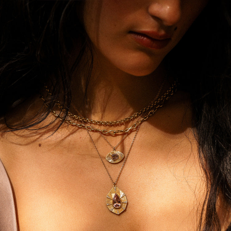 Brooke's Talisman collection embodies a spiritual journey with special gemstones, hand engraved patterns and colored enamel enhancing internal beauty