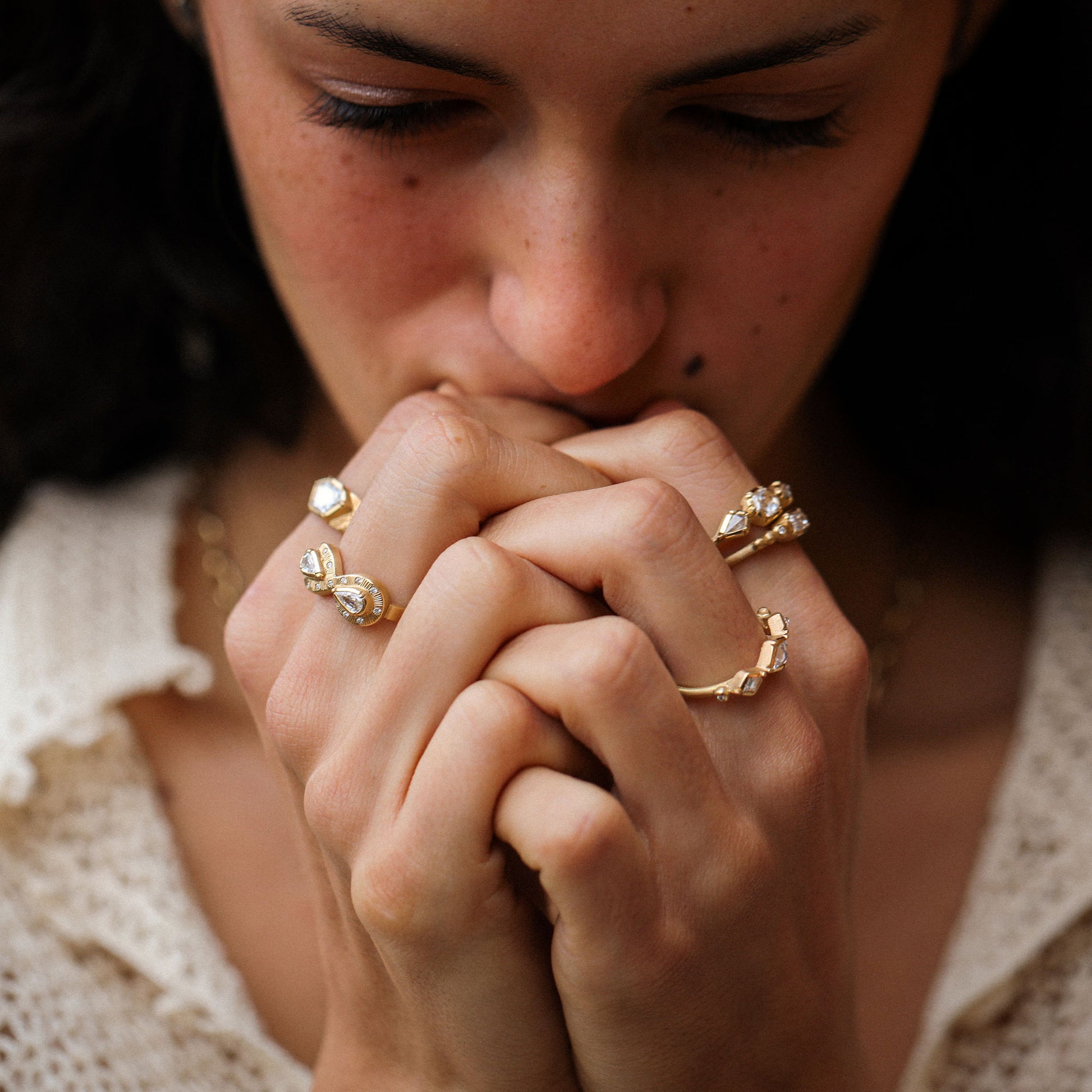 From Brooke's Utopia Collection white teardrop Diamond ring with hand engraving and diamond pave sparkle.