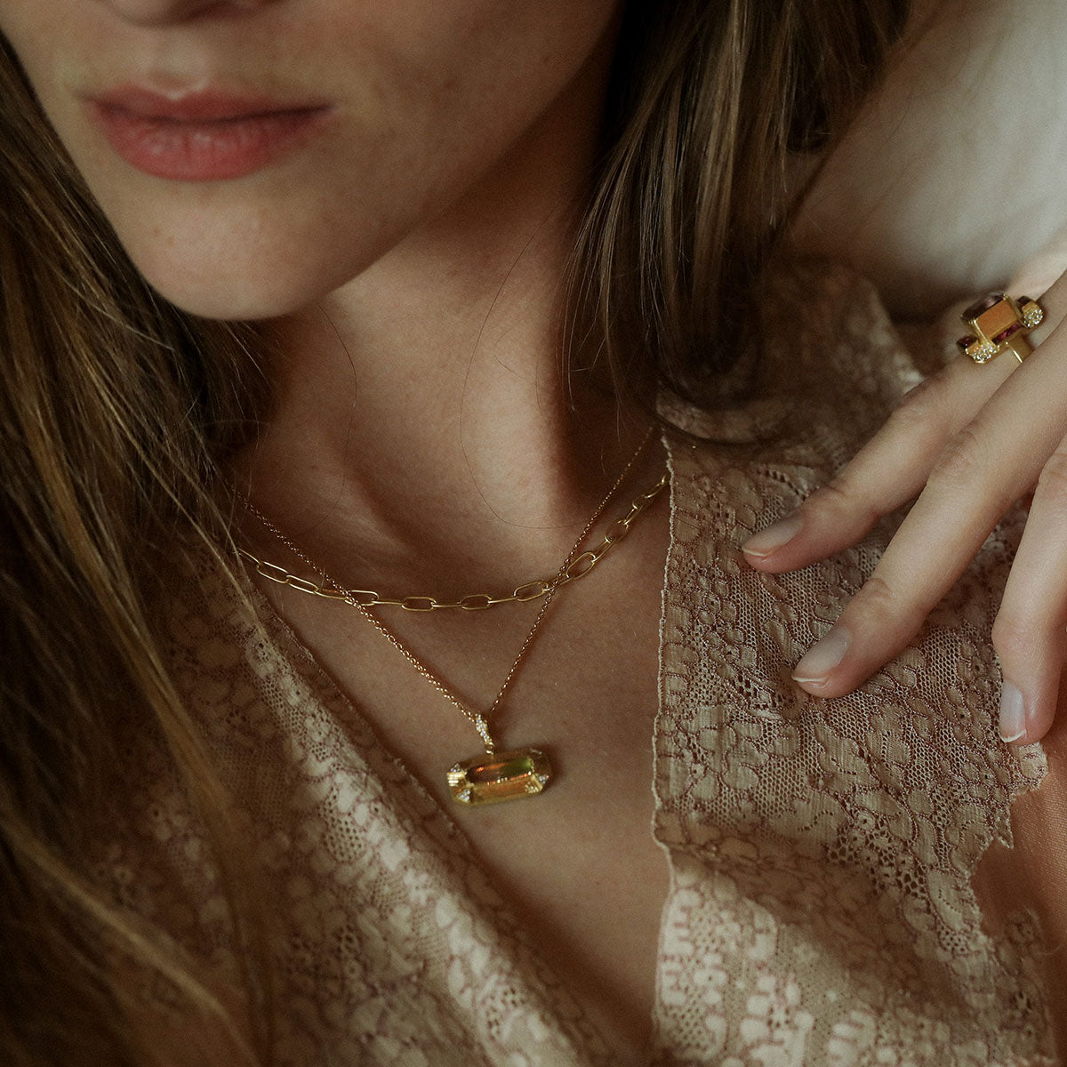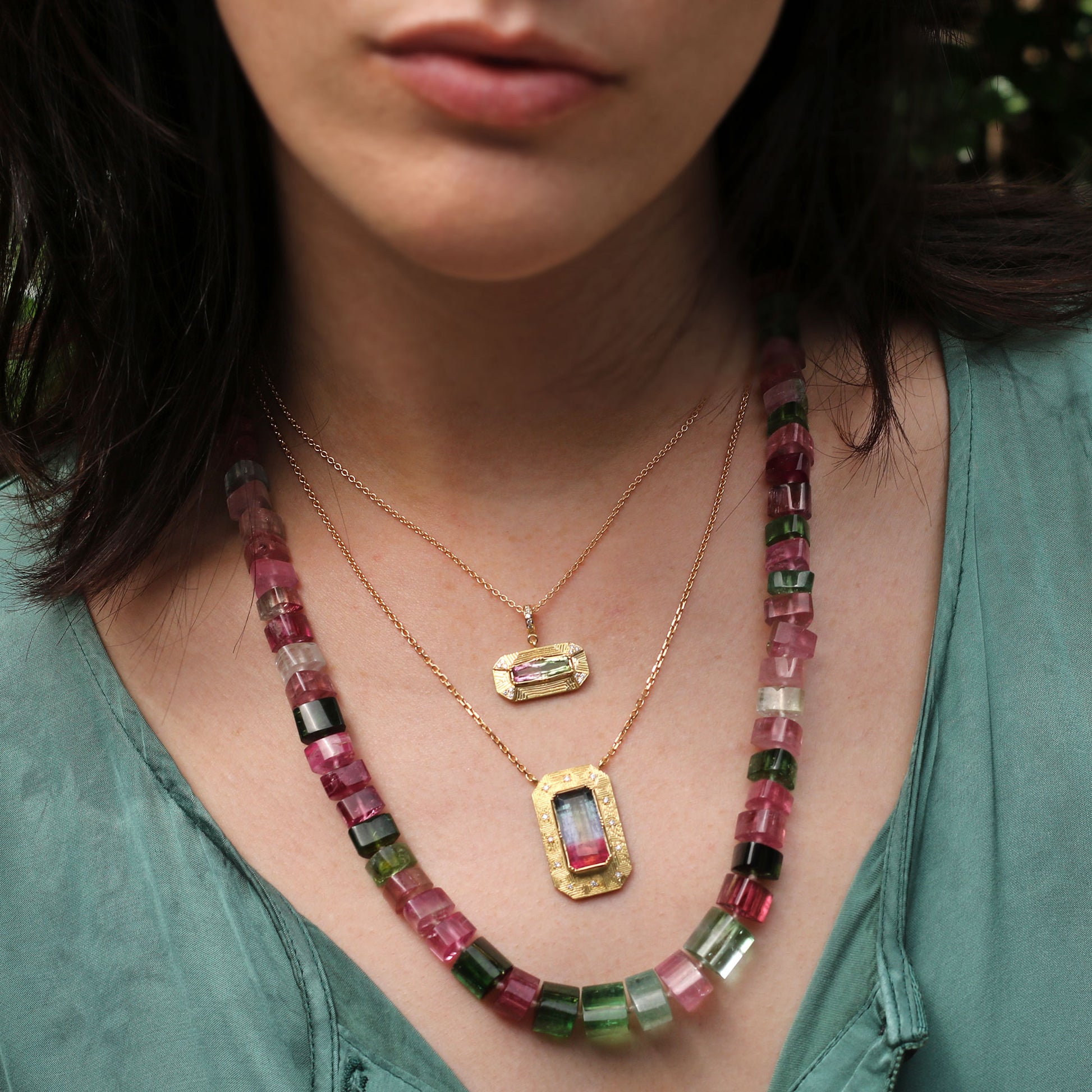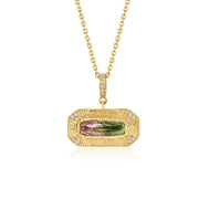 From Brooke's Utopia Collection, 18k gold bi colour Tourmaline necklace with hand engraving and white Diamond pave corner accents.