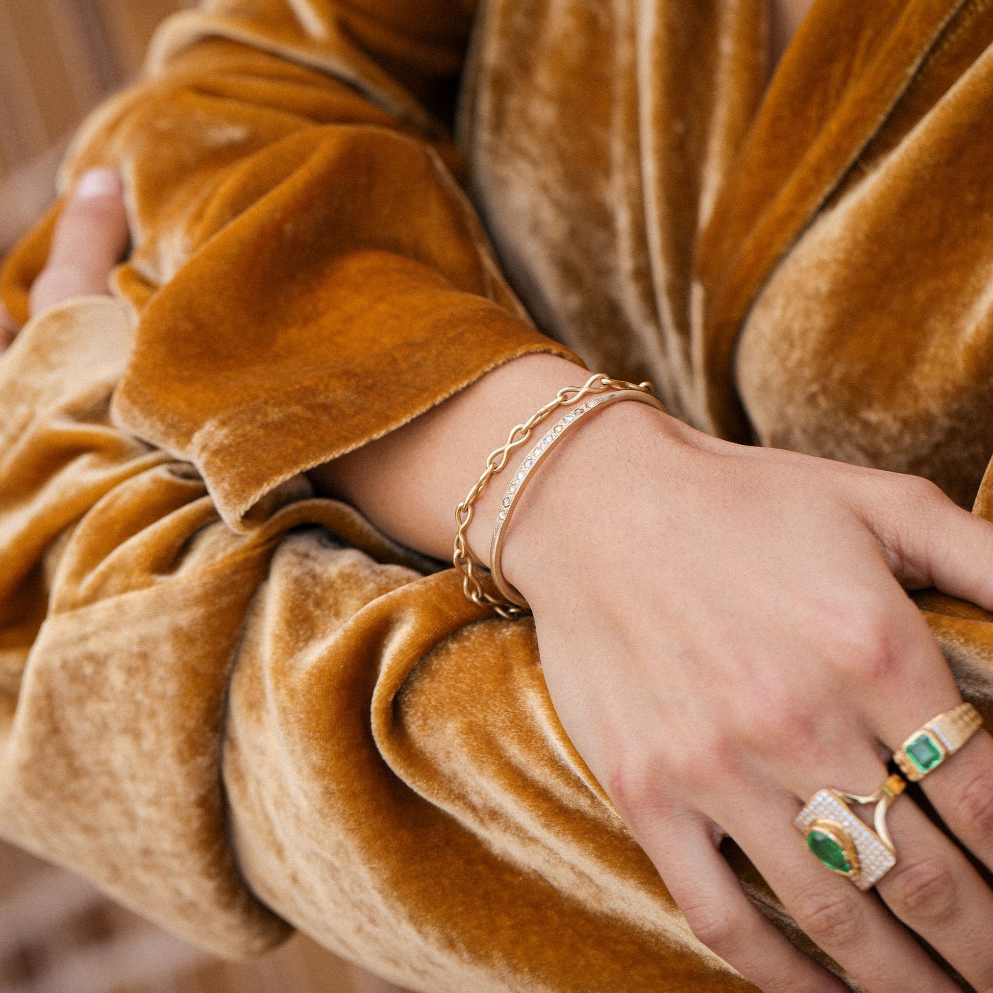 Endlessly fluid in form, the Mobius Bracelet captures the poetry of infinity. Crafted in 18K gold, each hand-hammered link reflects light with organic radiance. A perfect piece for layering or luminous on its own.