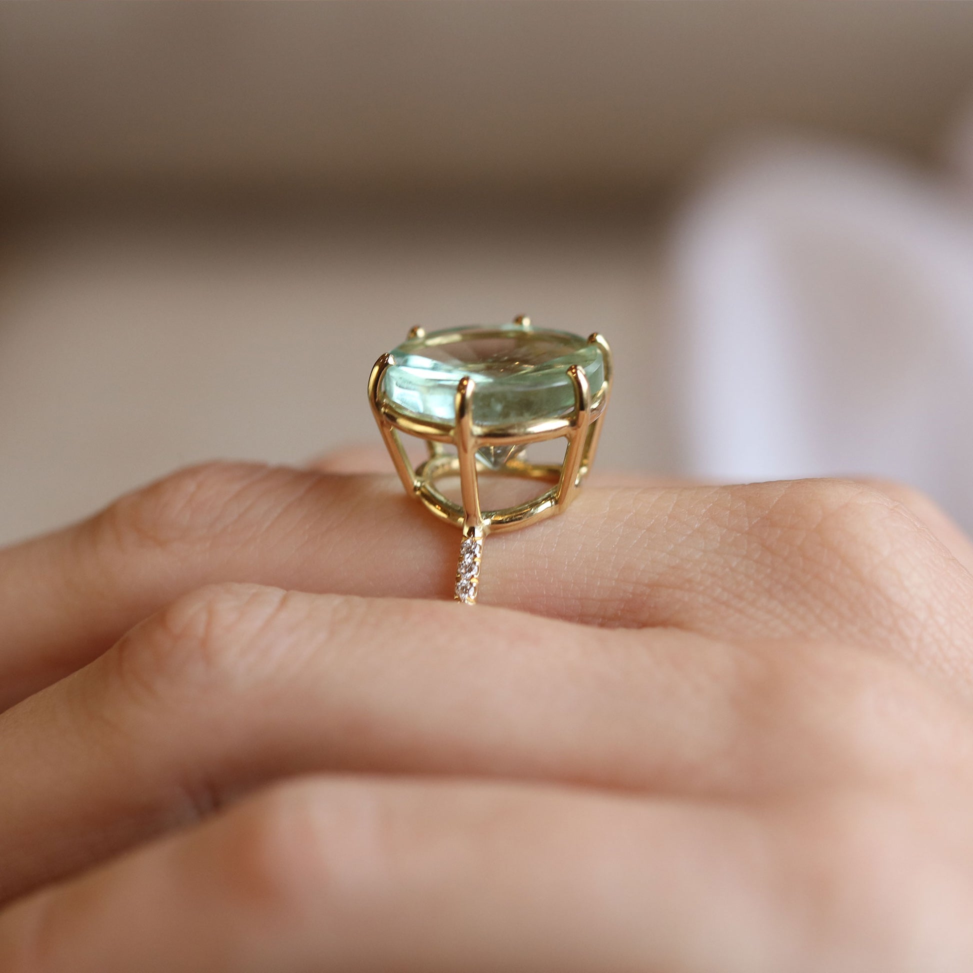From Brooke's Orbit Collection, one of a kind 18k gold Aquamarine ring enhanced with white Diamond pave band.