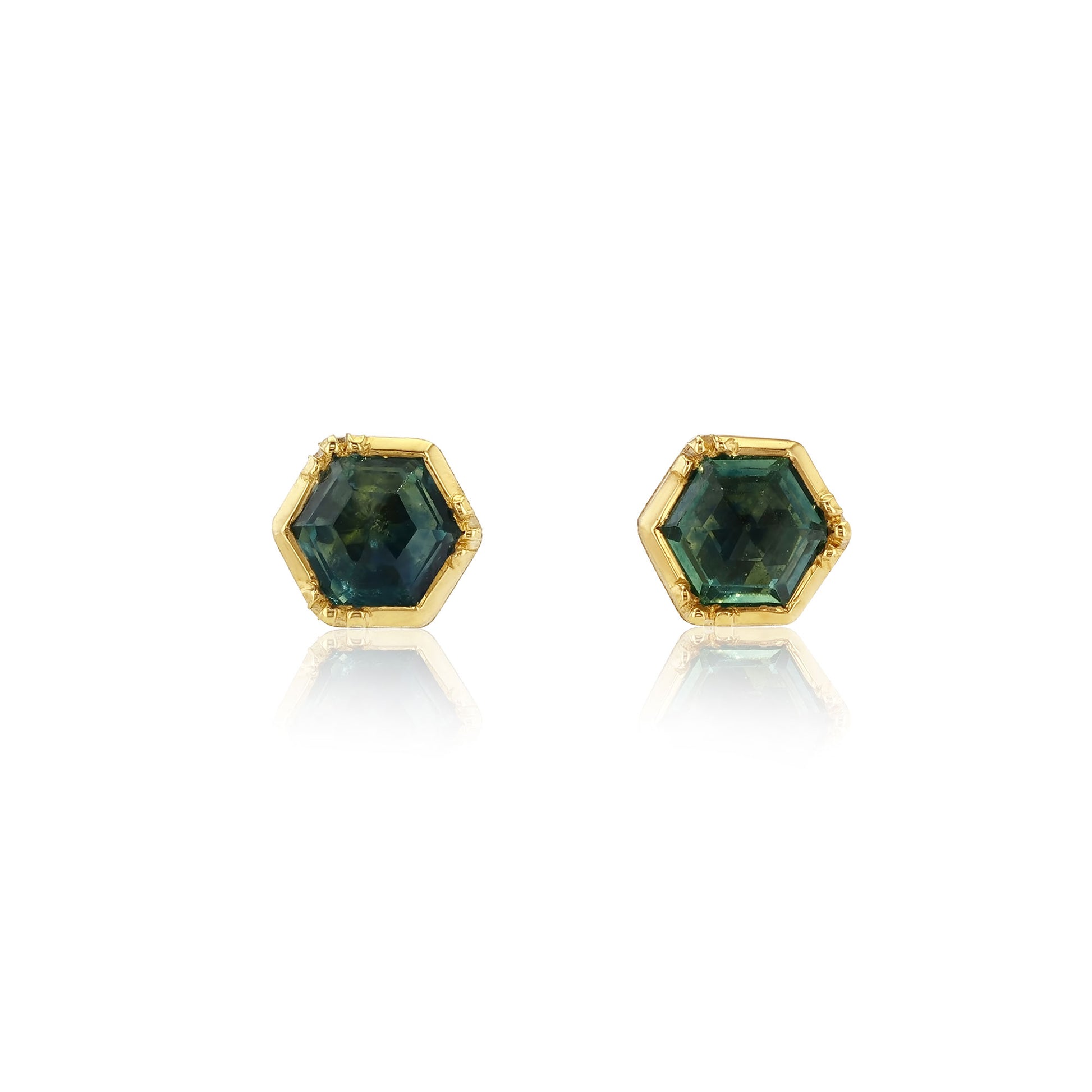 Hexagon cut Sapphire studs set in warm 18k gold
