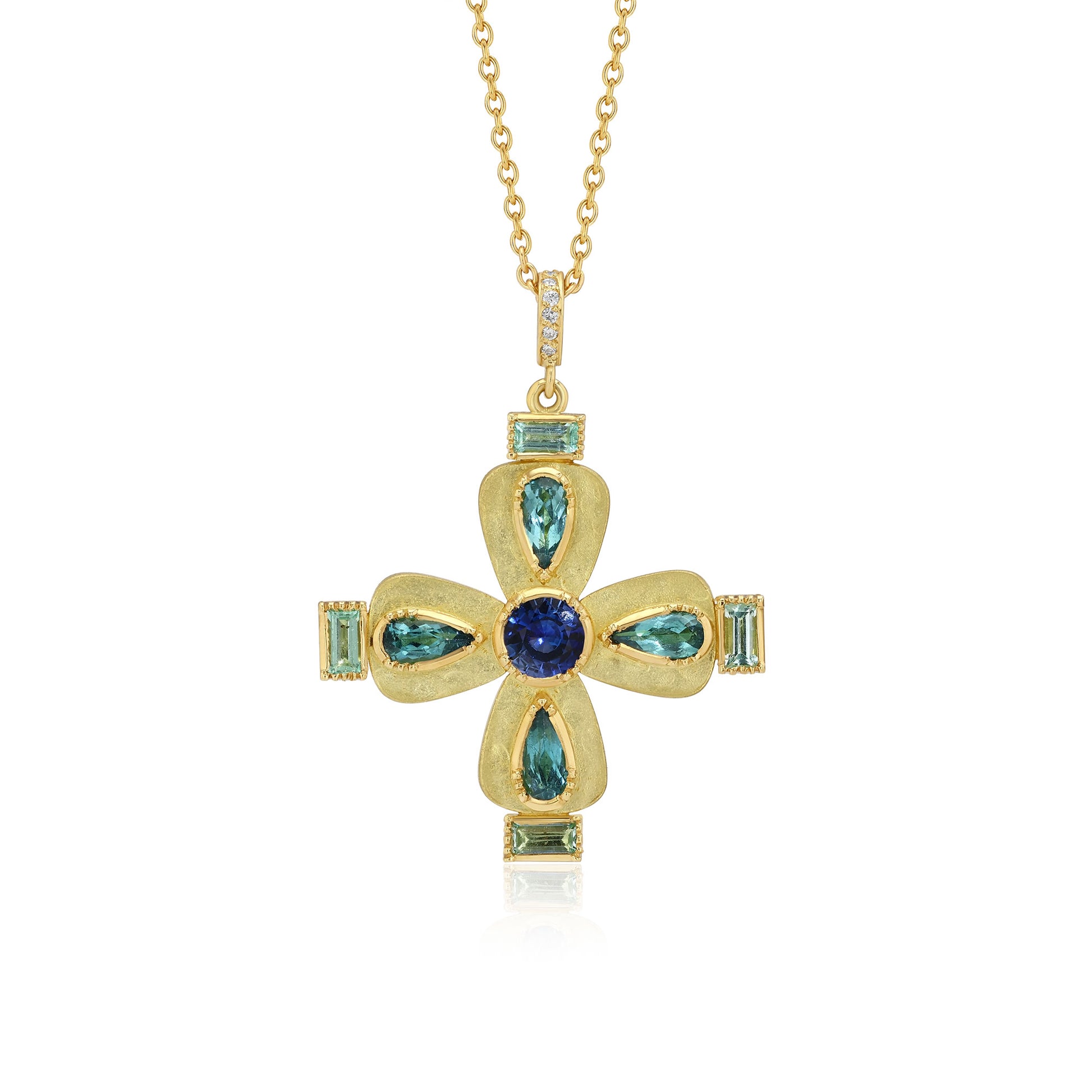 One-of-a-kind 18k gold Sapphire, Emerald, and Tourmaline Cross Necklace with traditional Georgian-inspired setting. Balancing modern shapes with traditional techniques, pale emerald baguettes add a modern accent to the rare indicolite tourmaline pear details and a traditional blue sapphire center. The tonal color combination makes this piece an everyday wearable work of art.