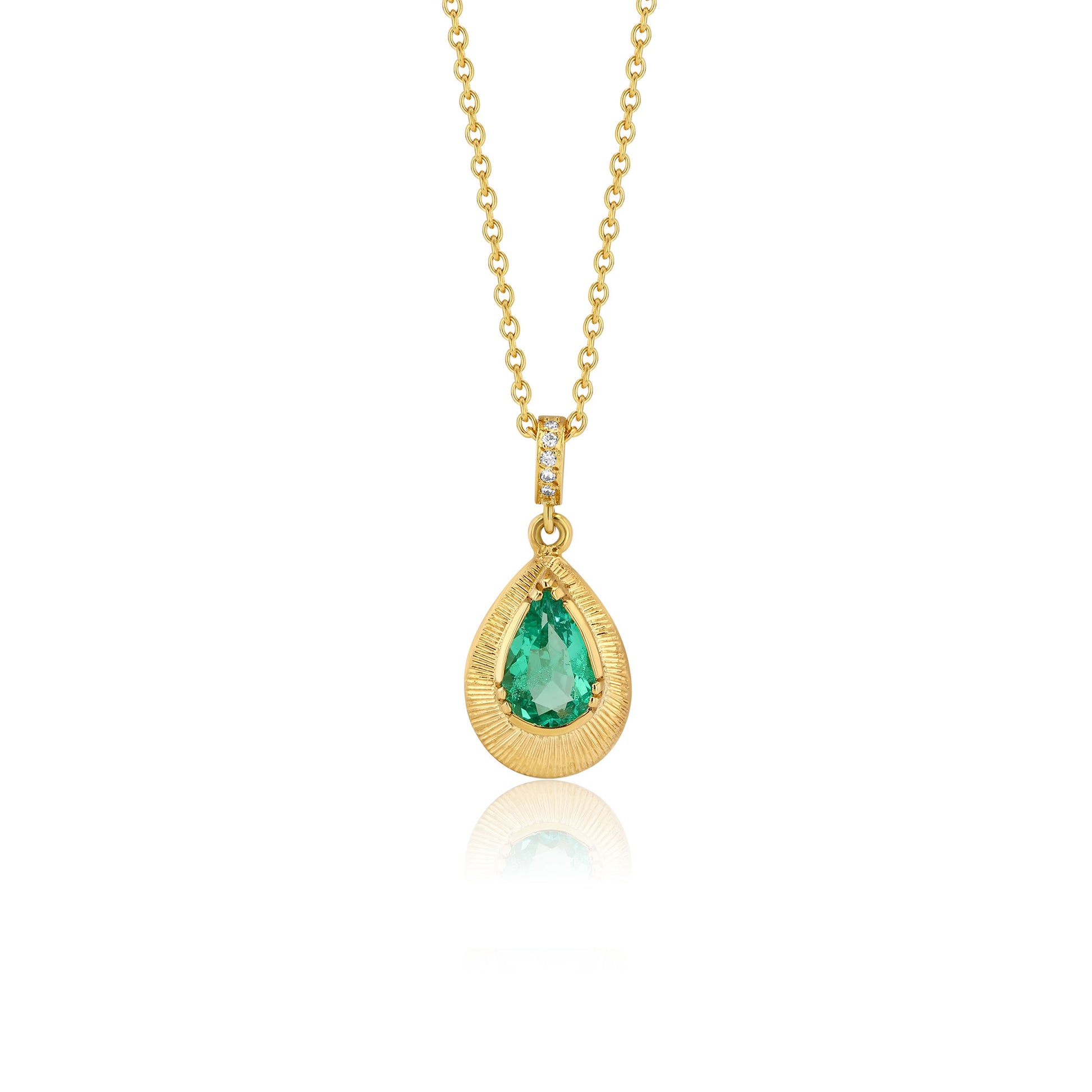One of a kind 18k gold emerald teardrop necklace with diamond bale.