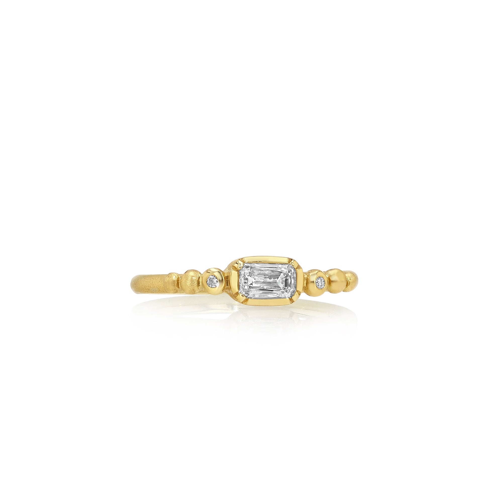 18k gold georgian style bezel diamond ring with diamond pave beaded band detail.